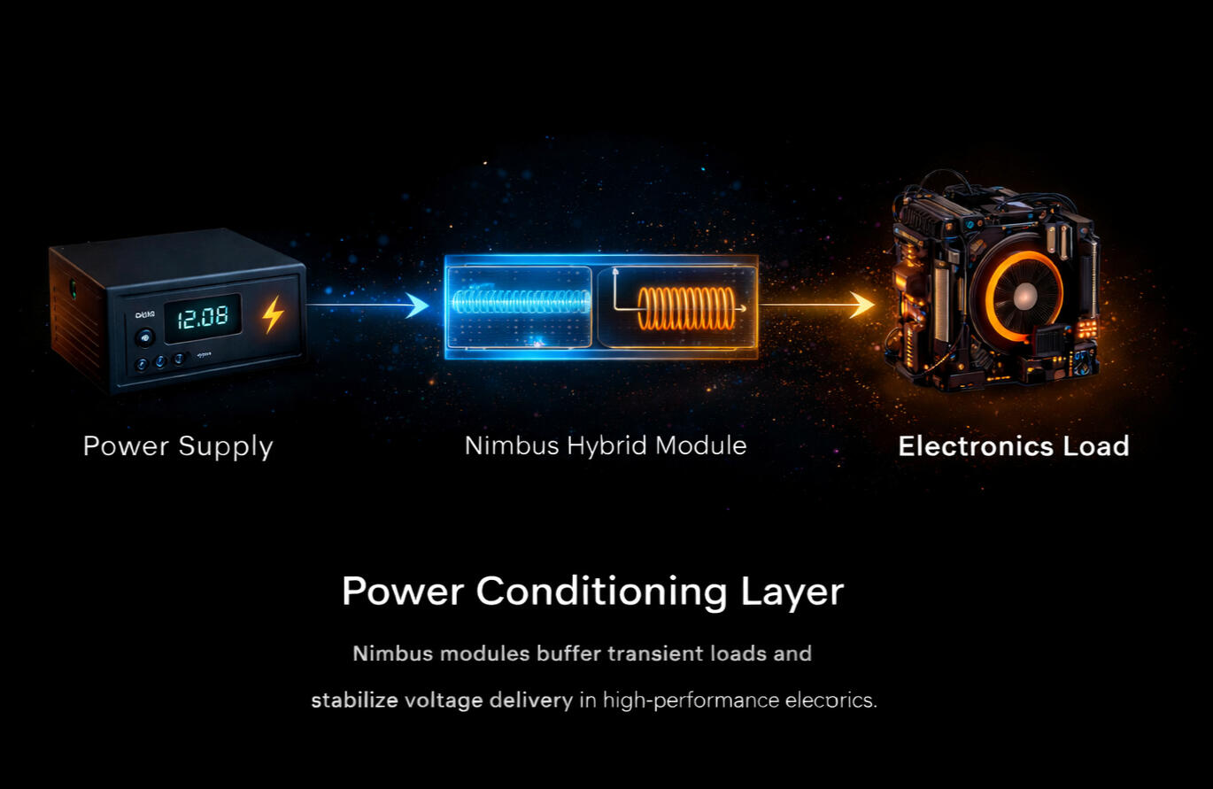 • systems require additional cooling and overheadNimbus addresses this by managing how energy is delivered, not just how it is stored.Unlike traditional capacitors, Nimbus operates as a distributed, system-level energy layer rather than a fixed component.